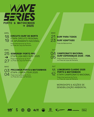 Entre abril e outubro de 2025, as praias de Matosinhos e do Porto serão palco de diversas competições nacionais e regionais de surf, incluindo etapas do Circuito Surf do Norte (18 e 19 de abril), Liga MEO Surf (25, 26 e 27 de abril), Junior Tour (3 e 4 de maio), Campeonato Nacional de Surf Esperanças Feminino (4 e 5 de outubro) e Campeonato Nacional de Longboard (11 e 12 de outubro) (ver cartaz).
